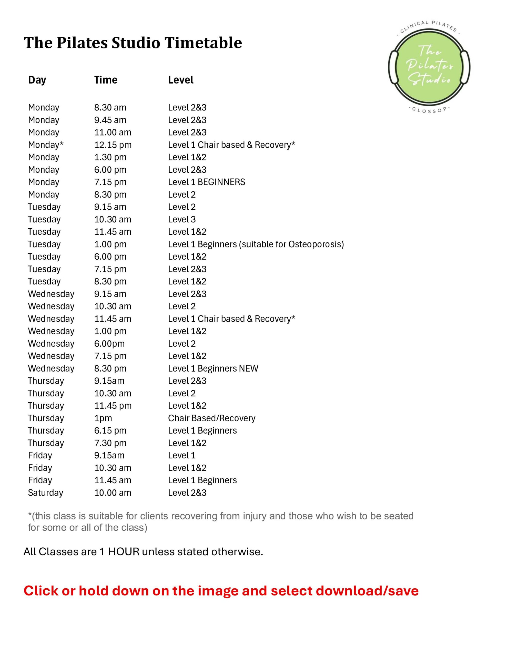 Timetable New 12 week Timetable starts January 5th *(this class is suitable for clients recovering from injury and those who wish to be seated for some or all of the class) Download Timetable